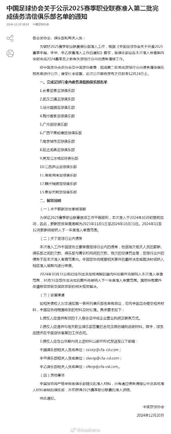 中國足協(xié)公示2025賽季職業(yè)聯(lián)賽準入第二批完成債務(wù)清償俱樂部名單,此前不在第一批名單里的長春亞泰、武漢三鎮(zhèn)、滄州雄獅、梅州客家、廣州、廣西平果哈嘹、南京城市、延邊龍鼎、黑龍江冰城、江西廬山、湖南湘濤、贛州瑞獅、泰安天貺全員上榜,相當(dāng)于所有三級職業(yè)俱樂部都進行了完成債務(wù)清償?shù)墓尽????